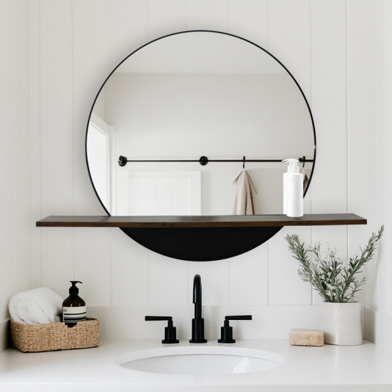 The round Salmin mirror is a stylish and functional element for any modern space. Made from high-quality glass with durable black metal and an integrated shelf, it offers additional storage for cosmetics, perfumes, or other personal items. It fits seamlessly into any room, adding a touch of luxury to the bathroom, bedroom, or even the hallway. Its minimalist design makes it easy to combine with all styles of decor.