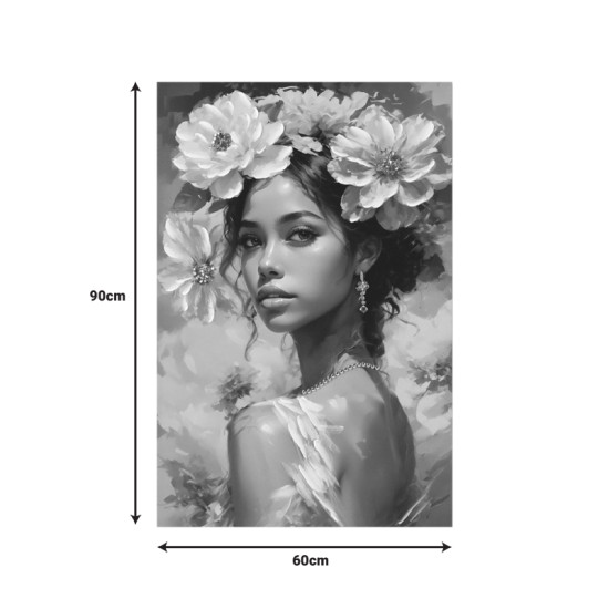 The Lilibet Ι canvas painting is a beautiful and striking work of art that celebrates feminine beauty and purity. The woman s face is the central point of interest. Her features are strong and expressive, conveying a sense of tranquility as well as power and self-confidence.