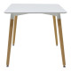 The white square table with distinctive wooden legs provides stability and a minimal aesthetic. It is paired with two beige chairs upholstered in fabric and featuring elegant black metal legs, ensuring comfort for you and your guests. Ideal for apartments and kitchens.